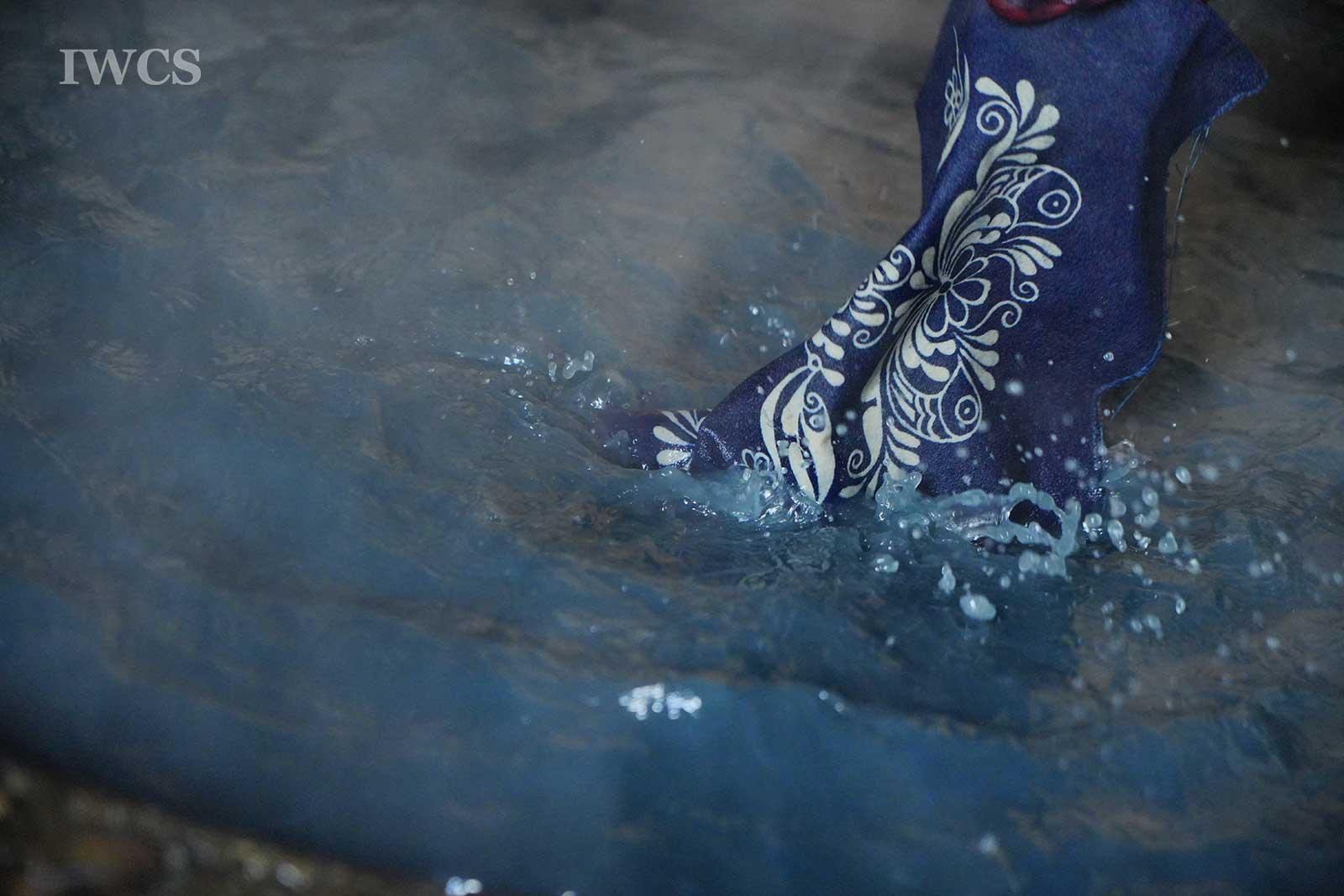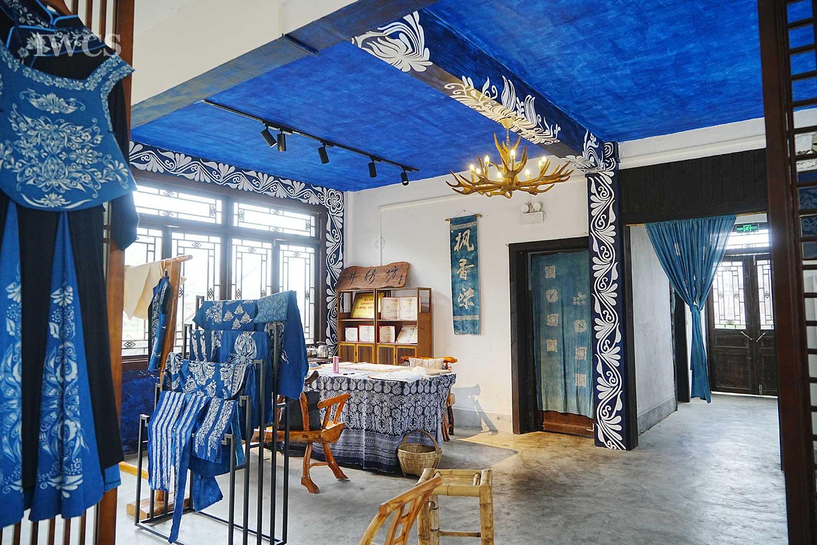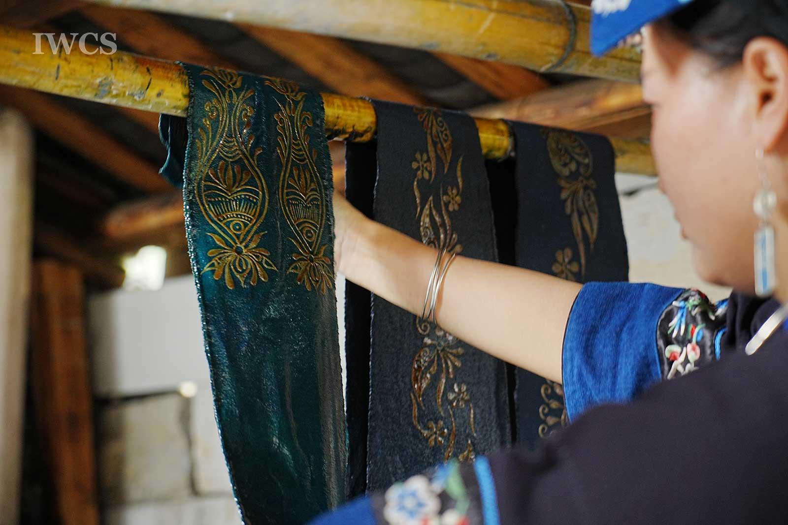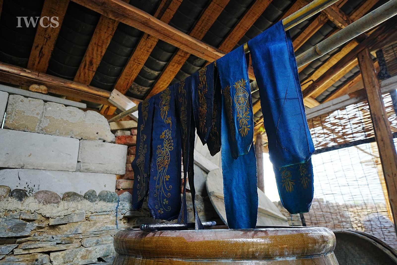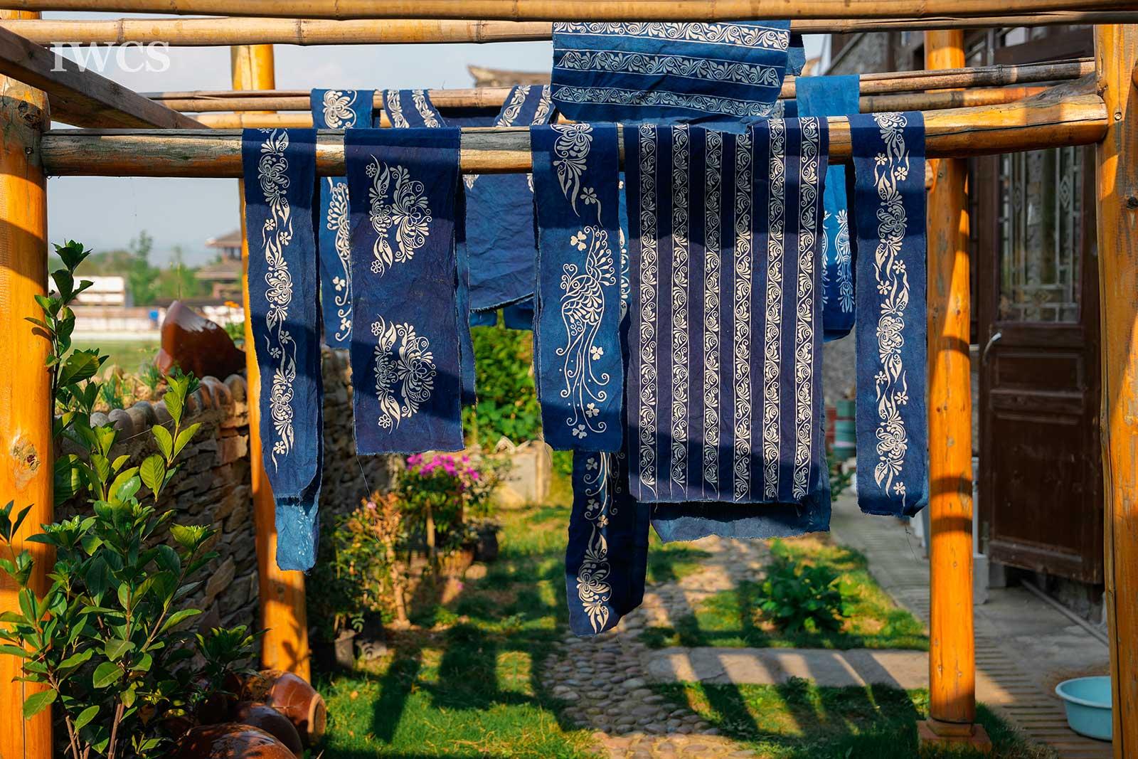 Fengxiang Dyeing is a traditional resist dyeing and printing technique. It involves using resin from old liquidambar formosana, mixed with a small amount of butter, which is simmered over low heat and then filtered to create maple oil used as a wax seal. A brush dipped in the melted liquidambar formosana oil mixture is used to paint patterns on handwoven white fabric. The fabric is then dyed with indigo, and after dyeing, the oil is removed by boiling the fabric in hot water, followed by rinsing in clean water, drying, and pressing. In 2008, Fengxiang Dyeing was included in the national list of Intangible Cultural Heritage.